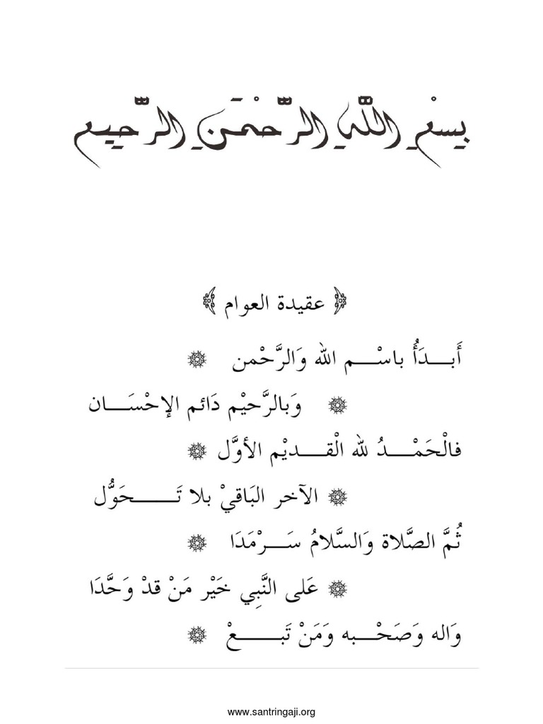 Ngawit abdi ku nyebat Allah nu welas. Unduh juga Terjemahan Kitab Aqidatul Awam. Kitab nadhom ini disusun ke dalam bentuk bait-bait.